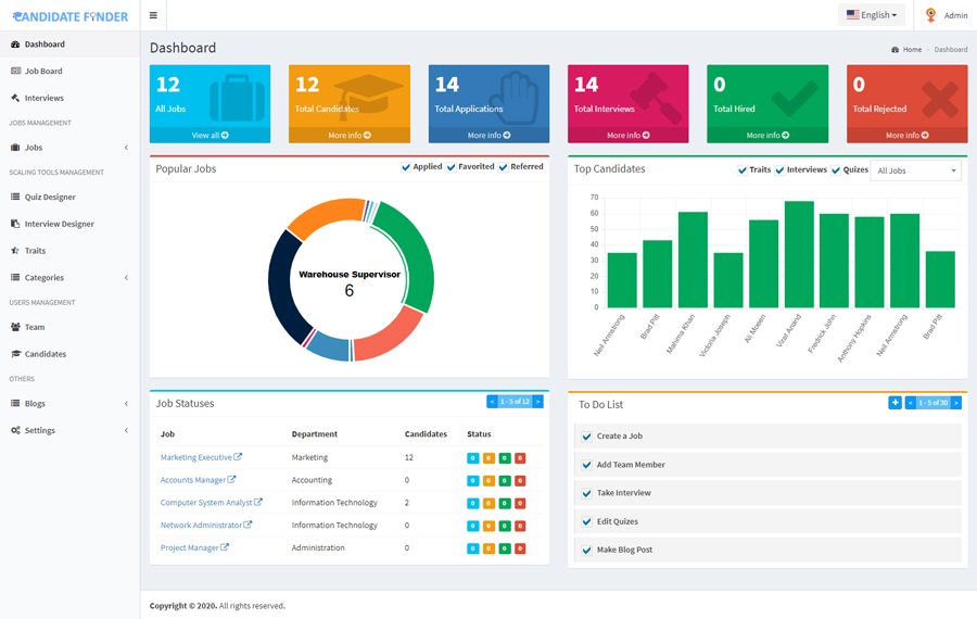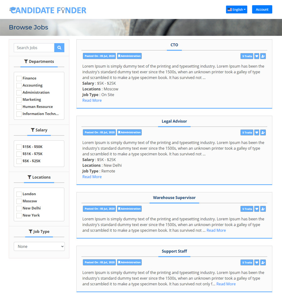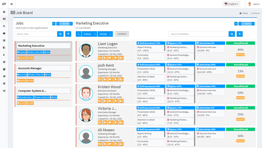 Candidate finder is an advance recruitment and applicant tracking system specially designed for any organization’s HR department or head hunting / recruitment firms. It’s unique job board offers you to do an analysis and scrutiny among applying candidates before having them on-board. The built in scaling tools (quizzes, interviews and traits) can be assigned to all or some particular candidates helping you to do an overall and specific comparison among them for their skills and abilities. You can download resumes, quiz results and interview results for all or a set of selected candidates by applying different filters.