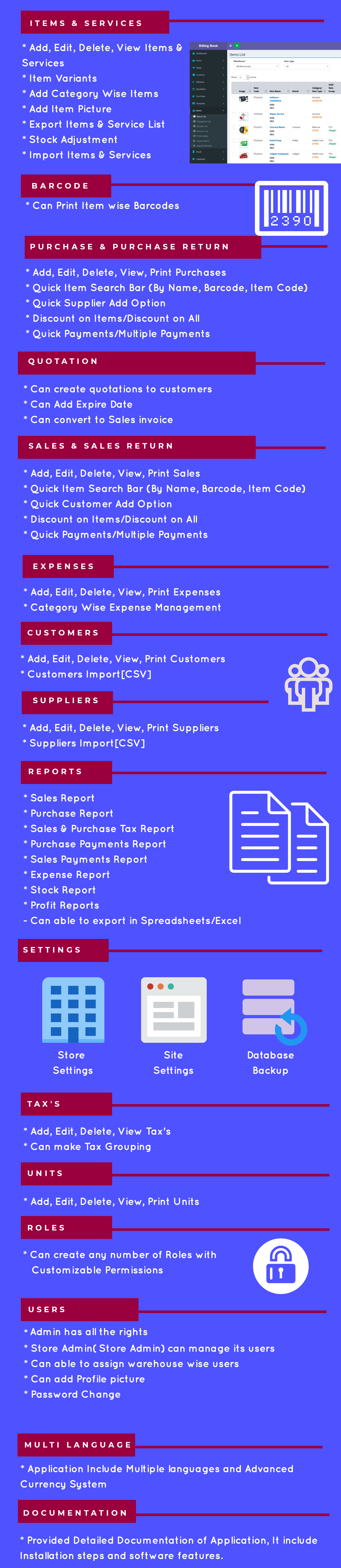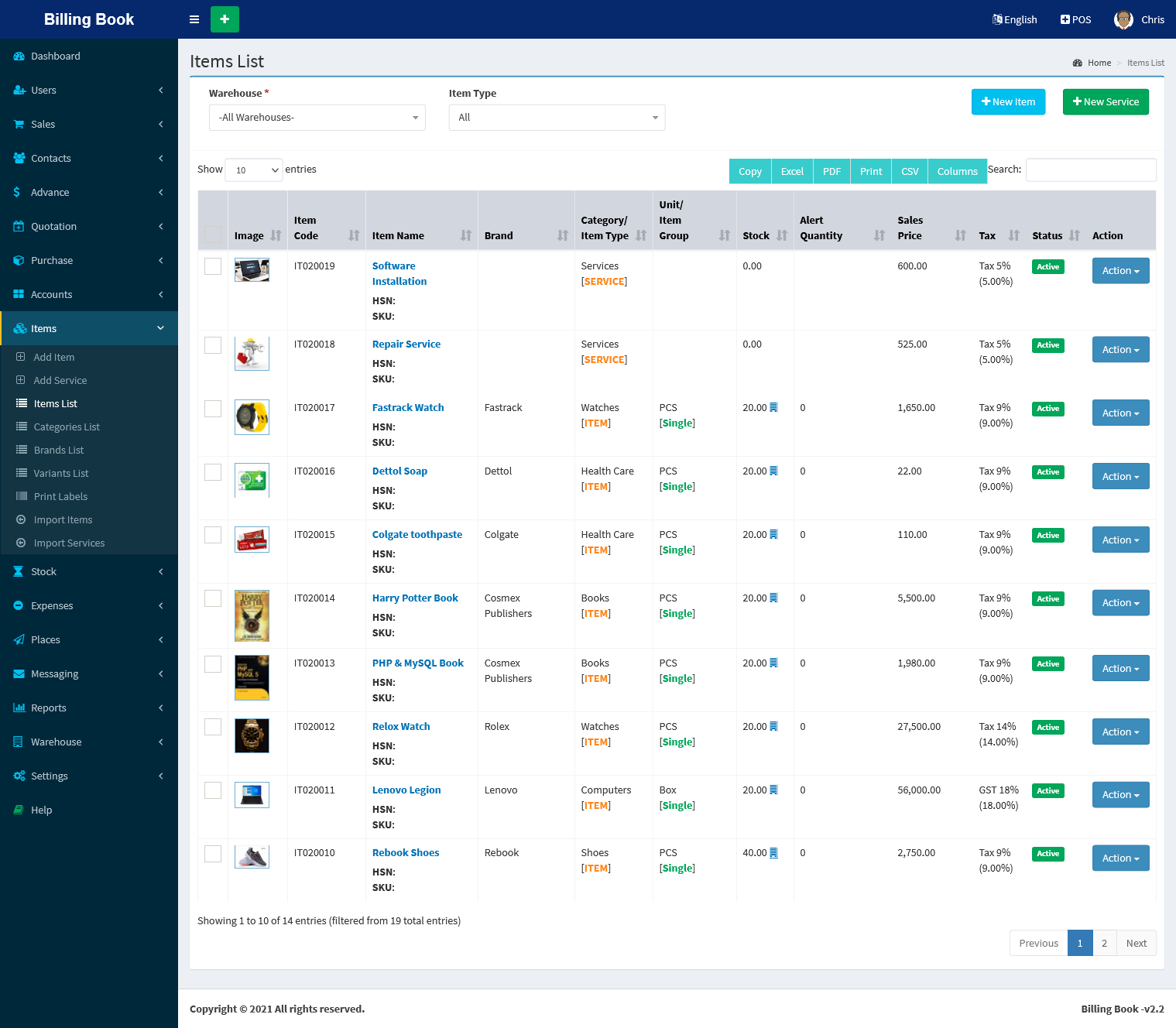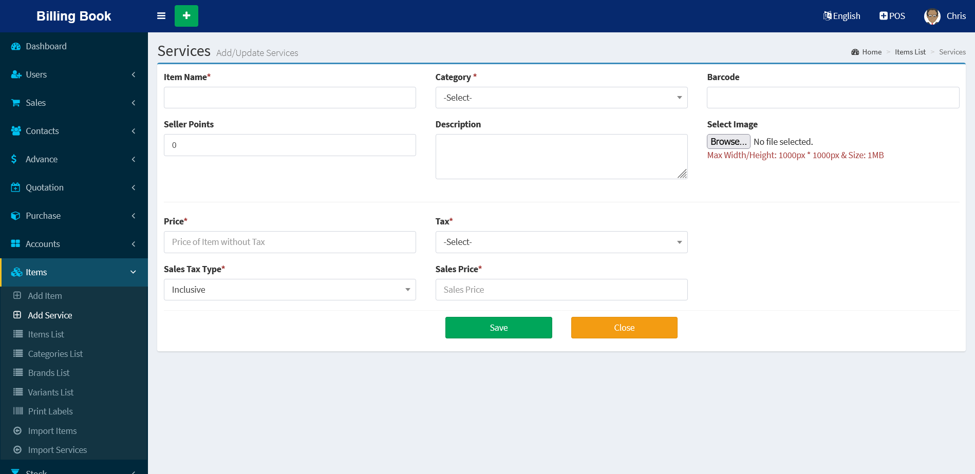 - Items & Service Management & Import [CSV] feature